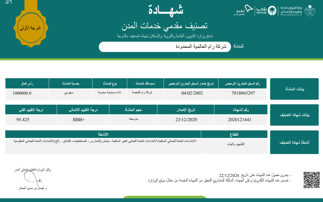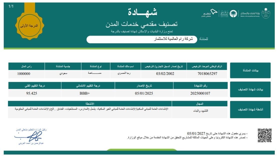 RAM Achieves Grade 1 Classification by the Ministry of Municipal and Rural Affairs
